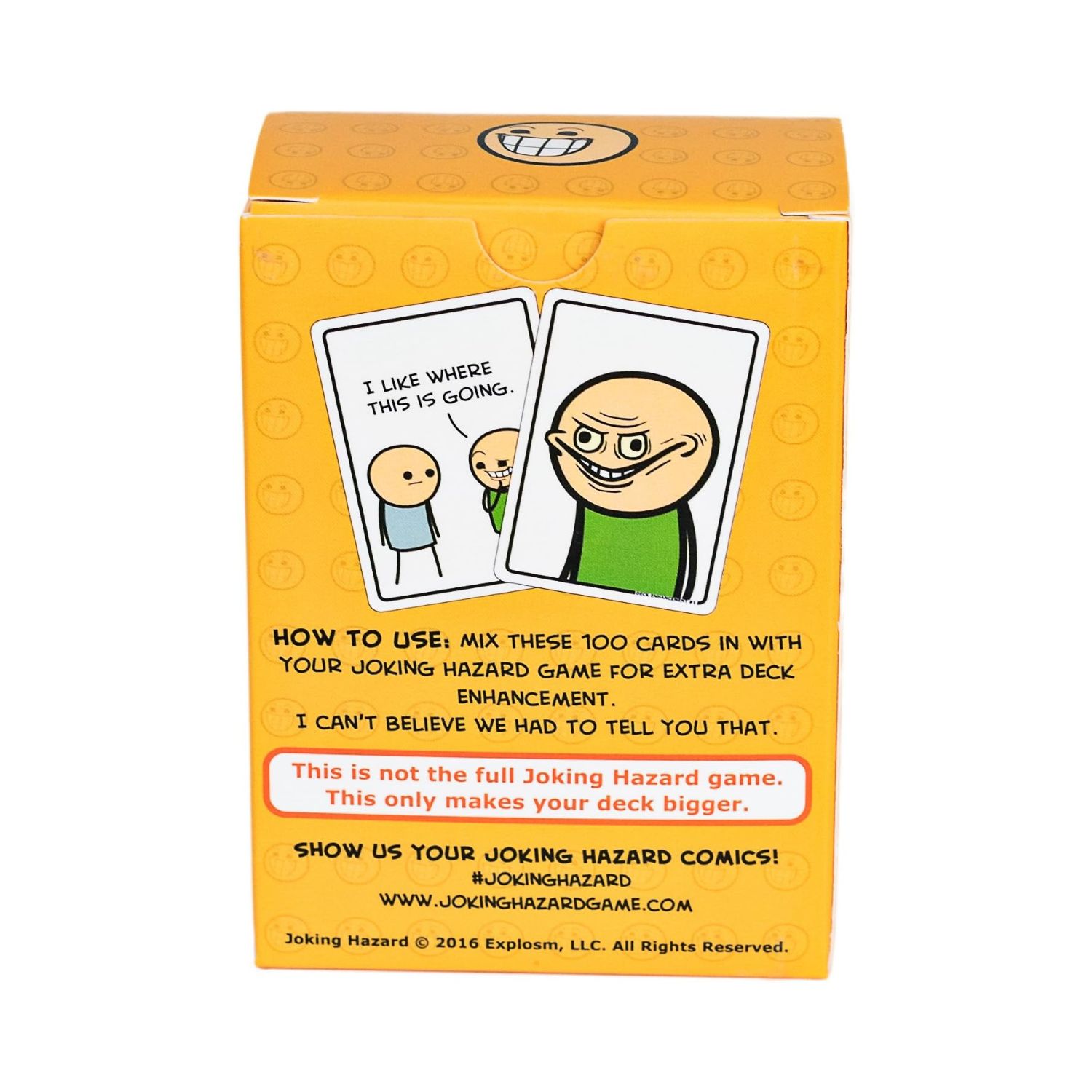 ეს 100 ბარათი აურიეთ ძირითადი Joking Hazard თამაშის ბარათებში, რათა გაზარდოთ კარტების რაოდენობა და გაამრავალფეროვნოთ თამაშის კომბინაციები.